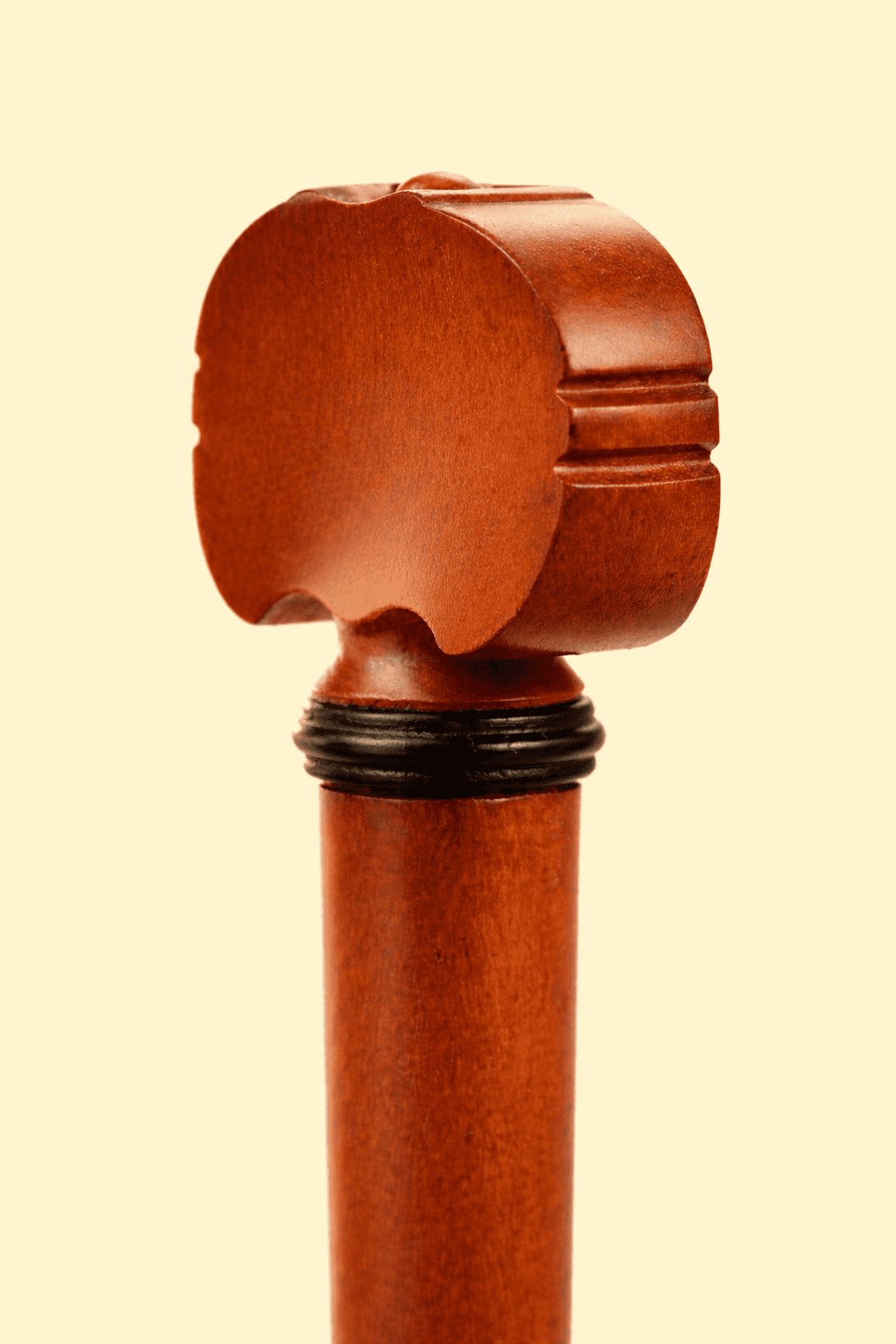 Traditionally made in boxwood with ebony collars it can be available in other woods with a choice of wood or ivory alternative mounts. Shown here in stained Boxwood with Ebony collar. No pip because the end of the peg has a profile which makes the pip superfluous.